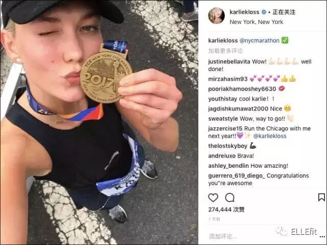 而平常就是健身狂人的Karlie Kloss,除了各种力量训练以外,月初还在纽约完成了人生第一个全程马拉松,用时4小时41分50秒。
