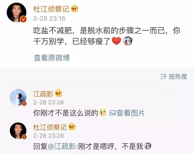 但是杜江在江疏影的微博下辟谣了,说吃盐是为了脱水准备,并不能减肥。还说江疏影已经够瘦了,千万不要学。