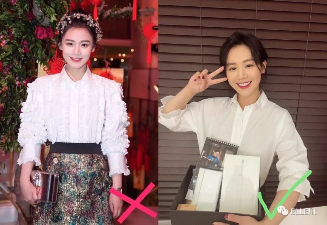 也不是所有衬衫都合适,加了大量膨胀花边的剪裁衬衫也不见得适合我们,参考马思纯。