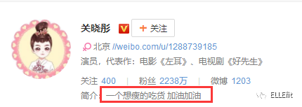 不过关晓彤对自己的定位还是很清晰的。她微博的介绍就是“一个想瘦的吃货。”还需“加油!”
