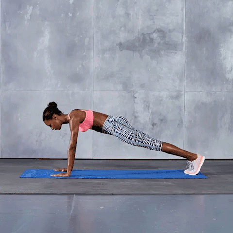 伸直手臂支撑地面撑起身体,提膝,膝盖去碰同侧肘关节。核心收紧,脊柱挺直,颈部和肩膀不要掉下去,每组40秒。