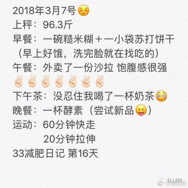 袁姗姗自从开了减肥日记之后,也是不遗余力地宣传她奇怪的减肥食谱。终于,依靠单纯少吃或者不吃,在坚持了16天后,喝起了奶茶。