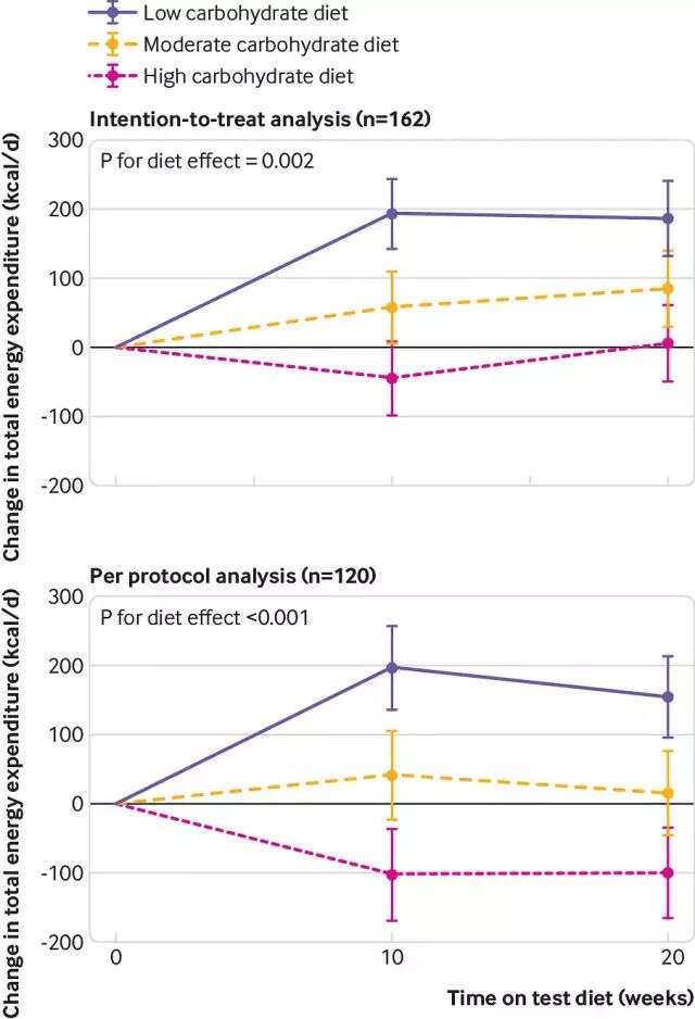 但明显的是,低碳水组每天能量消耗比高碳水组高出250大卡,中碳水组比高碳水组多消耗111大卡。