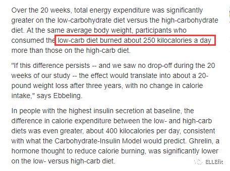 在经历了20周的监测后,低碳水化合物饮食与高碳水化合物饮食相比,总能量消耗显着增加。在相同的平均体重下,饮用低碳水化合物饮食的参与者每天消耗的热量比高碳水化合物饮食高250大卡。