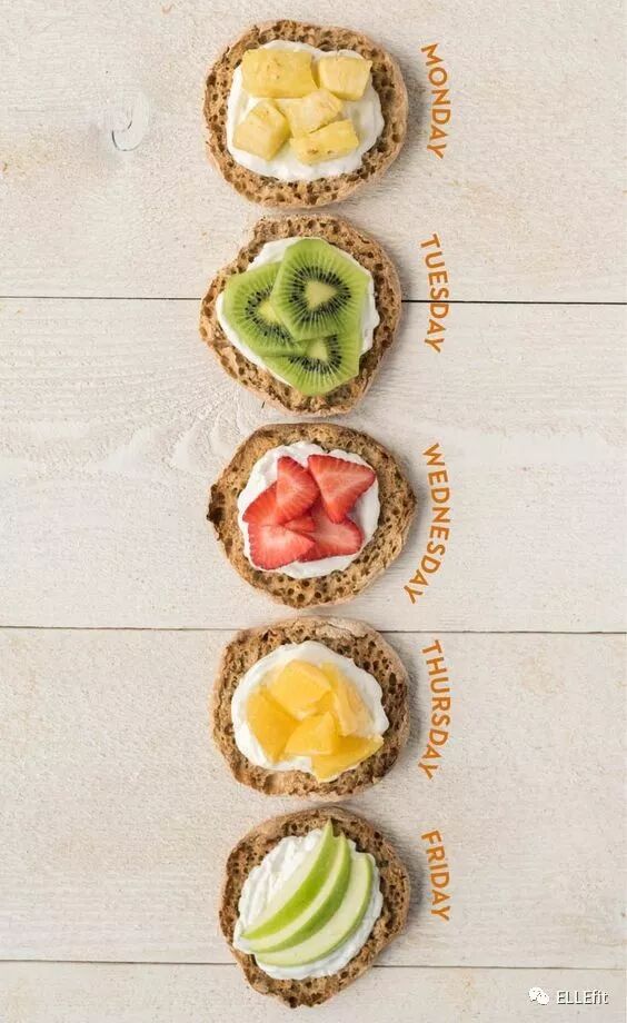 早餐:1片全麦面包+3汤匙无奶油芝士+半杯水果
